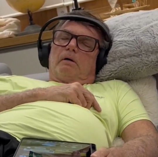No vídeo publicado na rede social X, Bolsonaro aparece dormindo, usando um abafador de ruídos no ouvido, enquanto segura um tablete ligado no colo. Segundo o filho, o registro não seria divulgado, pois “expõe mais uma situação terrível dos reflexos da facada que levou de um antigo integrante do PSOL”, no caso, Adélio Bispo.