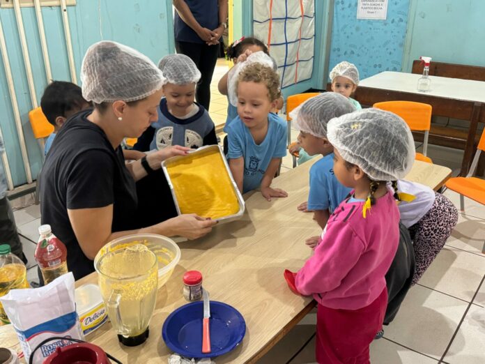 Este é o terceiro ano em que a EMEI realiza a oficina com todos os alunos. Para o grupo 1, a professora preparou um bolo de cenoura sem leite e ovos, com cobertura de chocolate 100% cacau. Os outros grupos confeccionaram cookies de banana com aveia. Os alunos puderam observar em tempo real o processo de preparação dos cookies e ajudaram a moldá-los, utilizando aveia.