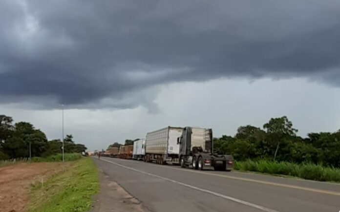 Engavetamento envolvendo carretas e caminhonete provocou lentidão na BR-163