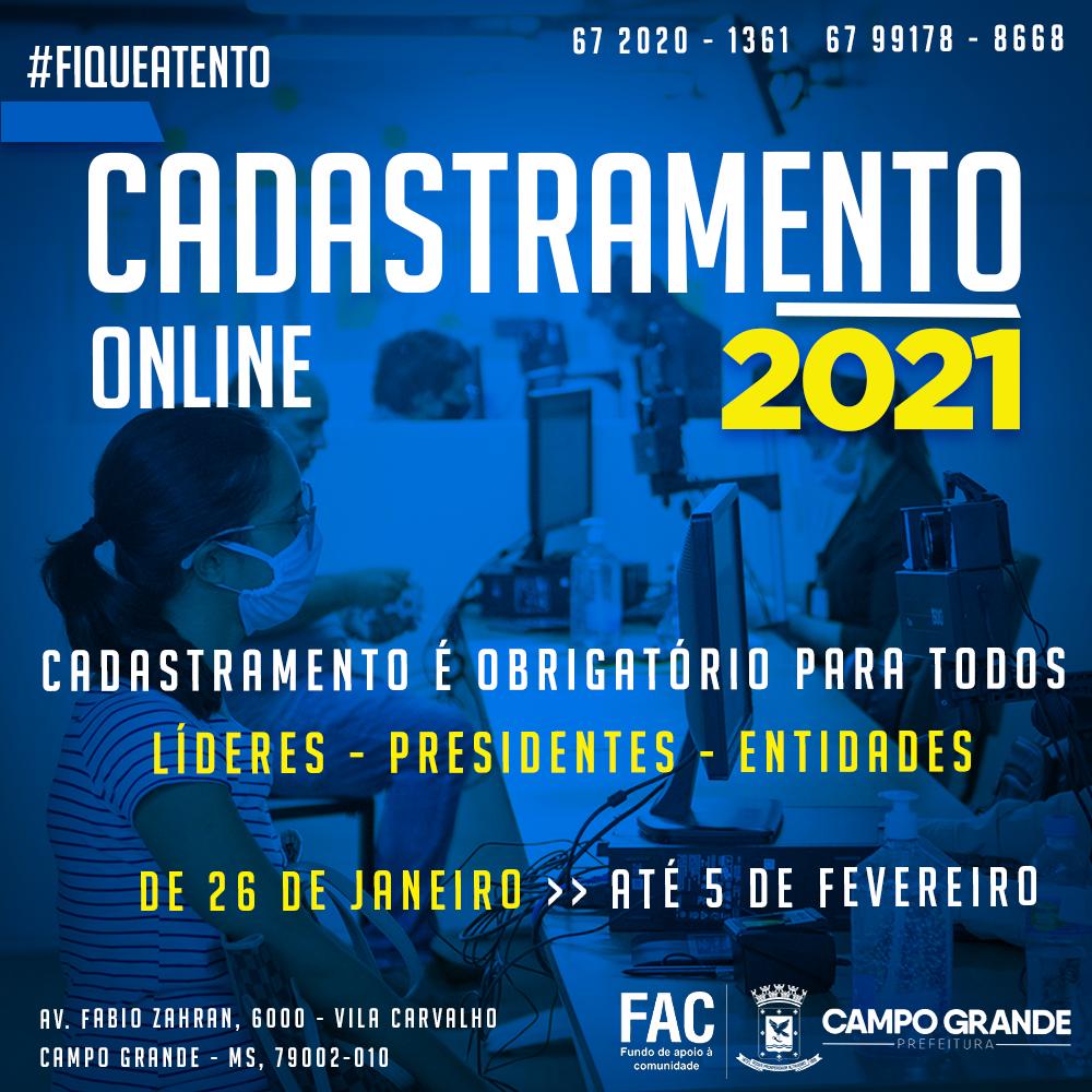 O cadastramento online de Líderes Comunitários, Associações de Moradores, Clube de Mães, ONGs e Instituições será aberto na terça-feira (26). o objetivo do cadastro é atualizar os dados cadastrais dos beneficiados e melhorar cada vez mais os atendimentos para dar continuidade aos serviços oferecidos pelo Fundo de Apoio à Comunidade (FAC).