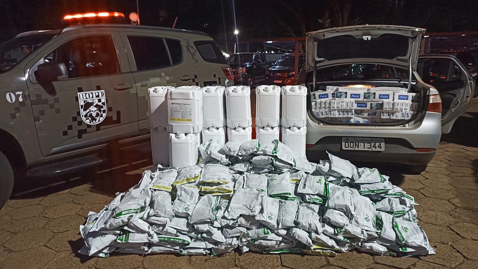 Na noite de ontem (9), equipes do Batalhão de Operações Policiais Especiais (Bope) e Batalhão de Choque da Polícia Militar apreenderam cigarros e agrotóxico no anel viário, em Campo Grande. Um homem foi preso.