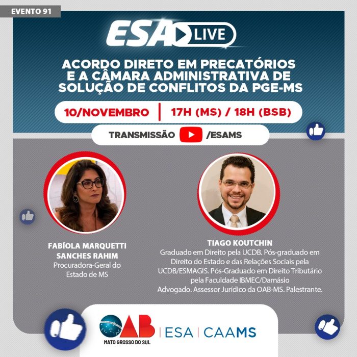 Promovida pela Escola Superior da Advocacia (ESA), palestra que vai falar sobre “Acordo Direto em Precatórios e a Câmara Administrativa de Solução de Conflitos da PGE-MS” será realizada nesta quarta-feira (10), às 17h (horário de MS).
