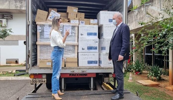 Kits para a montagem de 10 novos leitos de UTI-Covid no Hospital Auxiliadora, de Três Lagoas, foram entregues na manhã desta sexta-feira (18) pelo secretário estadual de Saúde, Geraldo Resende, à secretária municipal Elaine Furio, que esteve na SES representando o prefeito Ângelo Guerreiro.
