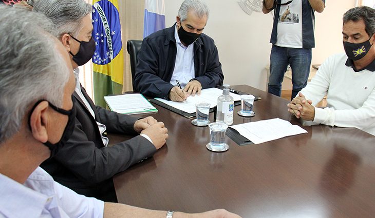 Nesta quarta-feira (4), o governador Reinaldo Azambuja recebeu o prefeito Marquinhos Trad na Governadoria para formalizar dois convênios entre o Detran-MS (Departamento Estadual de Trânsito de Mato Grosso do Sul) e Agetran (Agência Municipal de Transporte e Trânsito). Um objetiva a readequação viária da rotatória das avenidas Três Barras e José Nogueira Vieira, com Rua Marquês de Lavradio. O outro prioriza reforço nas ações de fiscalização do trânsito da cidade.