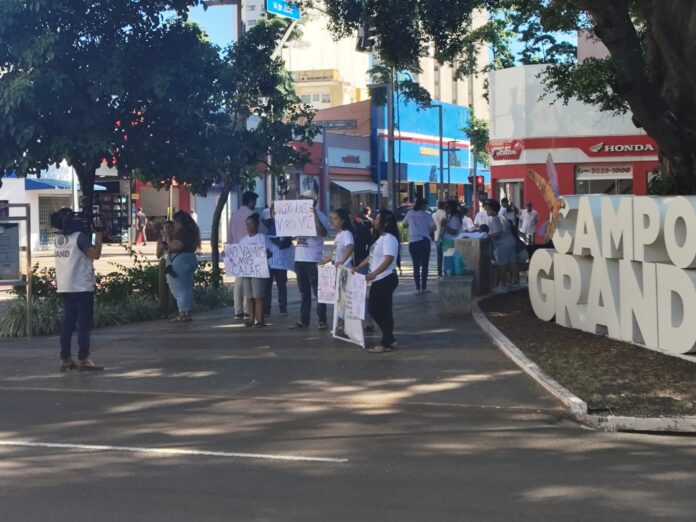 Usando camisas brancas e carregando faixas e cartazes, o grupo, composto por cerca de 20 pessoas, ocupou parte do canteiro central da Avenida Afonso Pena, no cruzamento com a Rua 14 de Julho, e também o semáforo da via.