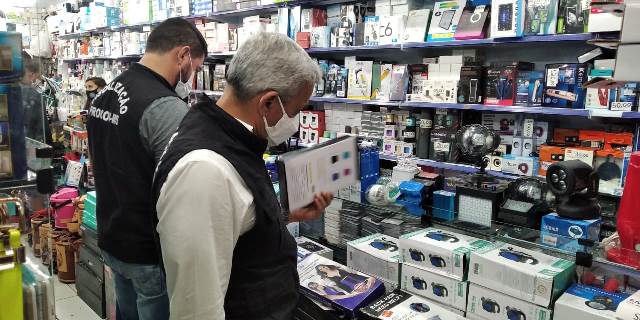 Além desses, e entre os inúmeros itens, foram retirados das lojas Studio monitor sound quality, Earphones tuned by original S9, Led room strobe light, Portable wireless sepeaker, Wi-fi panorama câmera, HD microfone enjoe music, Multifuncional mobile charging bracket, Car wireless music receiver, Mini keyboard backlit xbox 360, Web câmera full HD e, ainda, Blackhead removal microdermabrasion machine. Houve a apreensão de vários outros, que fizeram parte de uma extensa lista que fazem parte dos Autos de Infração e Termos de Apreensão expedidos.