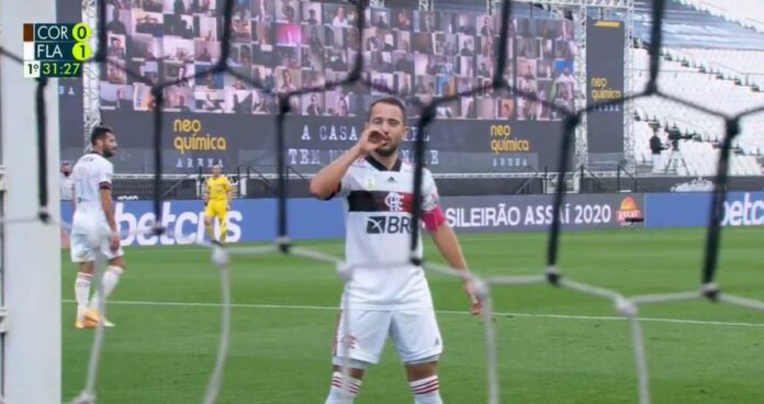 Diego fechou a goleada. O corintiano Gabriel tentou sair jogando, mas errou e a bola ficou Bruno Henrique, que abriu para Diego. O camisa 10 tirou de Gil e fez o quinto gol rubro-negro.