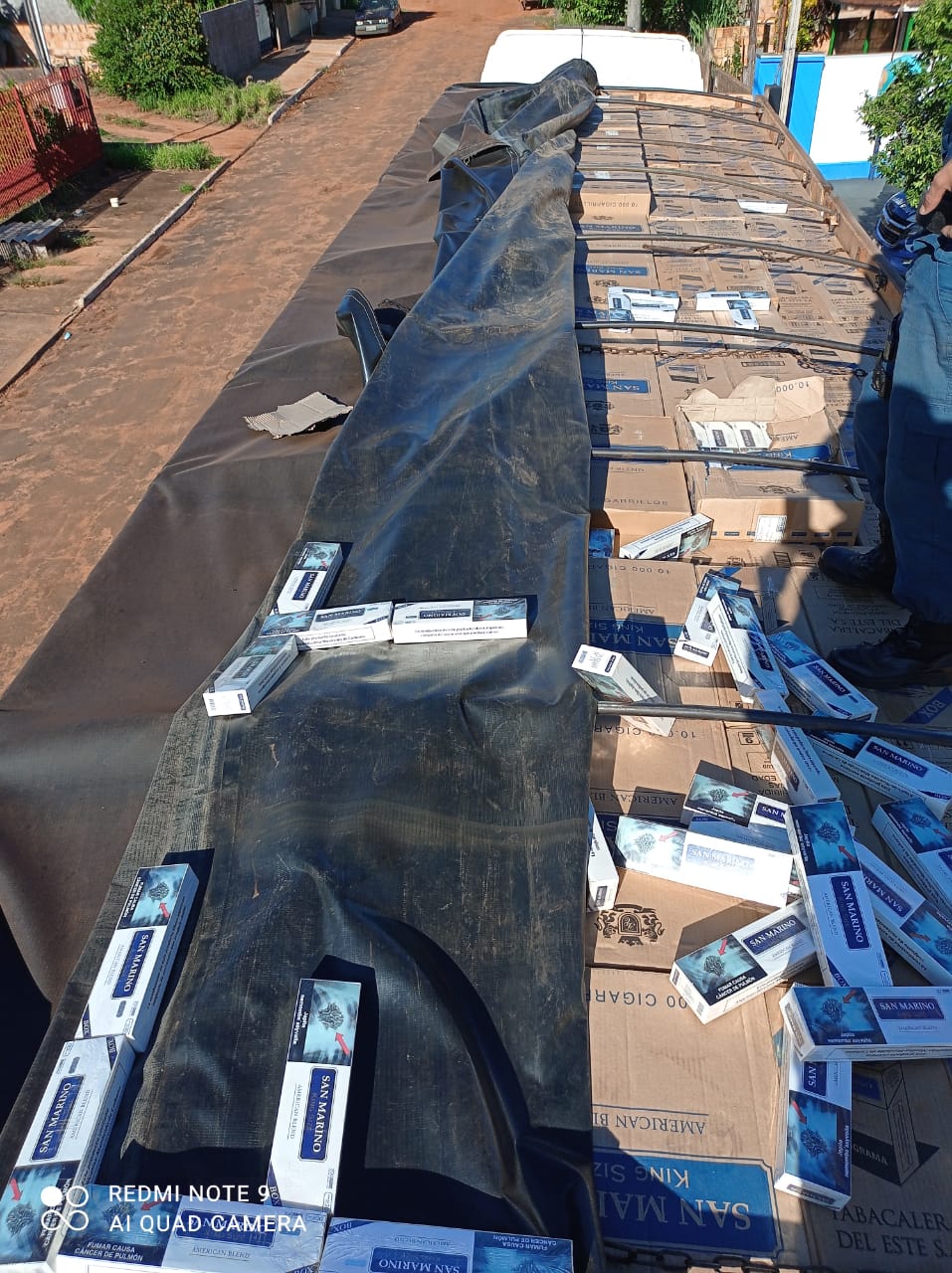 Uma equipe da Força Tática do 12° Batalhão de Polícia Militar de Itaquirai, durante patrulha na manhã de hoje (13), localizou no pátio de uma Oficina Mecânica, o Caminhão Trator Iveco/Stralis, de placas AUO-0J56, atrelado ao semi-reboque da marca Noma, de placas CLJ-1021, carregado com 50.000 mil pacotes de cigarro contrabandeado da marca “San Marino”, de origem paraguaia.
