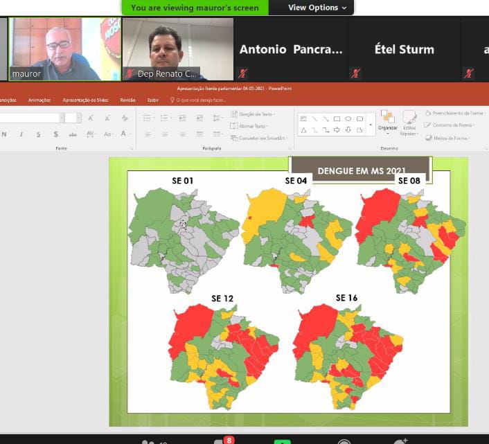 Os integrantes da Frente Parlamentar de Enfrentamento à Tríplice Epidemia: Dengue, Chikungunya e Zika realizaram, na tarde quarta-feira (04), a pedido do deputado estadual Renato Câmara (MDB) uma reunião ordinária virtual para debater o controle destas doenças no estado em tempo de Covid-19 e sobre a situação dos comitês de dengue nos municípios de MS, com análise dos membros da Coordenadoria de Vetores da SES/MS, Mauro Lucio Rosa e João Boin Junior.