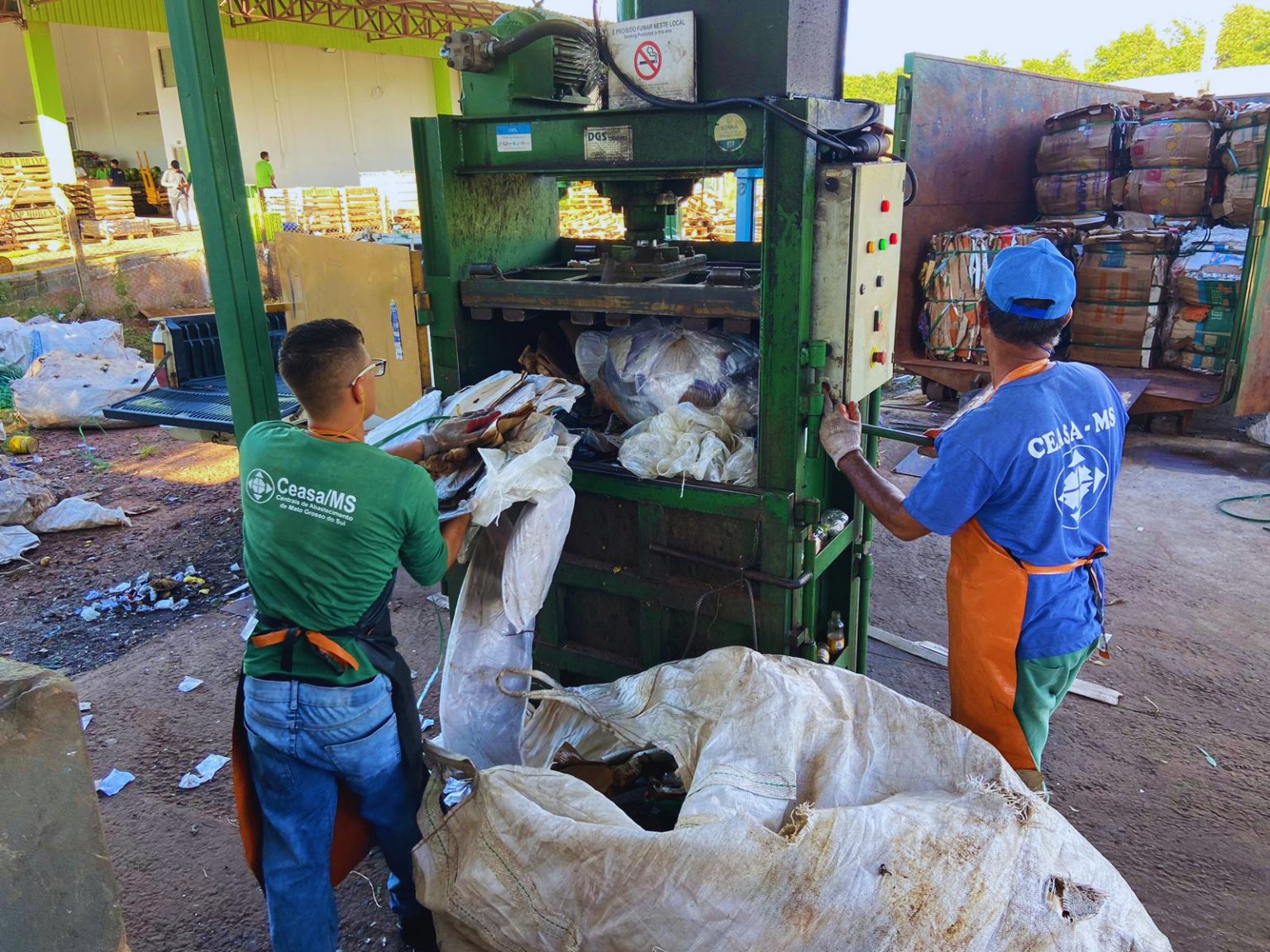 Na CGR, os resíduos são classificados por tipo, incluindo plásticos, fita PET, papelão, madeira — como paletes e caixotes — e matéria orgânica. Os materiais recicláveis, como papelão, plástico e fita PET, passam pelo processo de enfardamento por meio de prensa hidráulica, facilitando o armazenamento e o transporte para a reciclagem. No caso da madeira, especialmente os paletes, além do reaproveitamento, parte do material é destinada à comercialização, gerando receita e ampliando o ciclo de utilização desses itens.