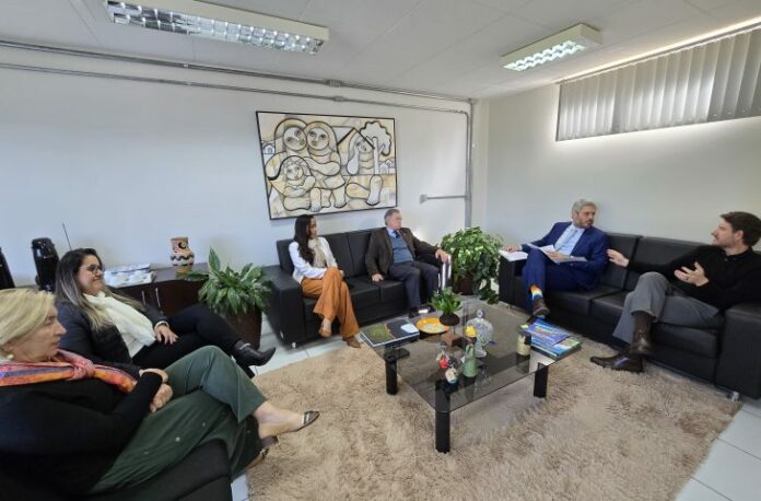 O secretário de Estado de Administração, Frederico Felini, e o secretário de Estado de Justiça e Segurança Pública, Carlos Videira, foram recebidos pelo superintendente do Patrimônio da União, Tiago Botelho, na manhã desta quarta-feira (29), na Superintendência do Patrimônio da União em Mato Grosso do Sul (SPU MS).