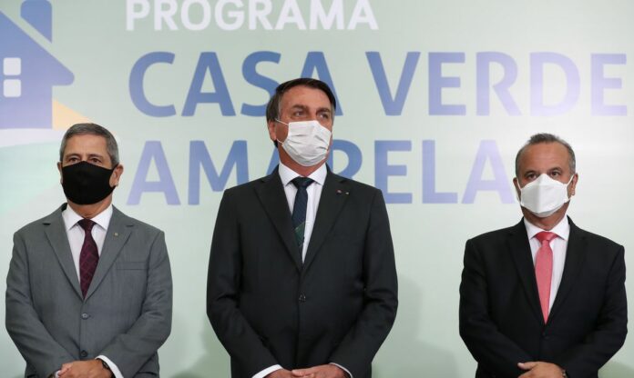 O ministro da Casa Civil, Braga Netto, o presidente da República, Jair Bolsonaro, e o ministro do Desenvolvimento Regional, Rogério Marinho, durante a cerimônia de lançamento do Programa Casa Verde e Amarela. Marcos Corrêa/PR Economia