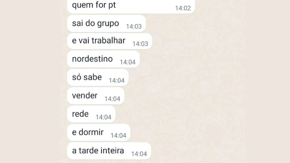 Logo na sequência, a mesma pessoa cita que “nordestino só sabe vender rede e dormir a tarde inteira”, conforme prints que estão sendo usados pela investigação.
