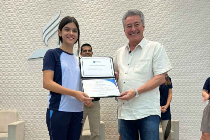 Na manhã de hoje, 23 de agosto, o deputado estadual Roberto Hashioka, do União Brasil, entregou uma moção de congratulação à aluna Rebeca Degobi, da Escola Adventista de Nova Andradina. Rebeca se destacou ao ficar entre os três maiores leitores do Brasil no ranking da Plataforma Árvore, uma biblioteca virtual adotada pela Rede Adventista de Educação. A iniciativa visa incentivar o hábito da leitura entre os estudantes.