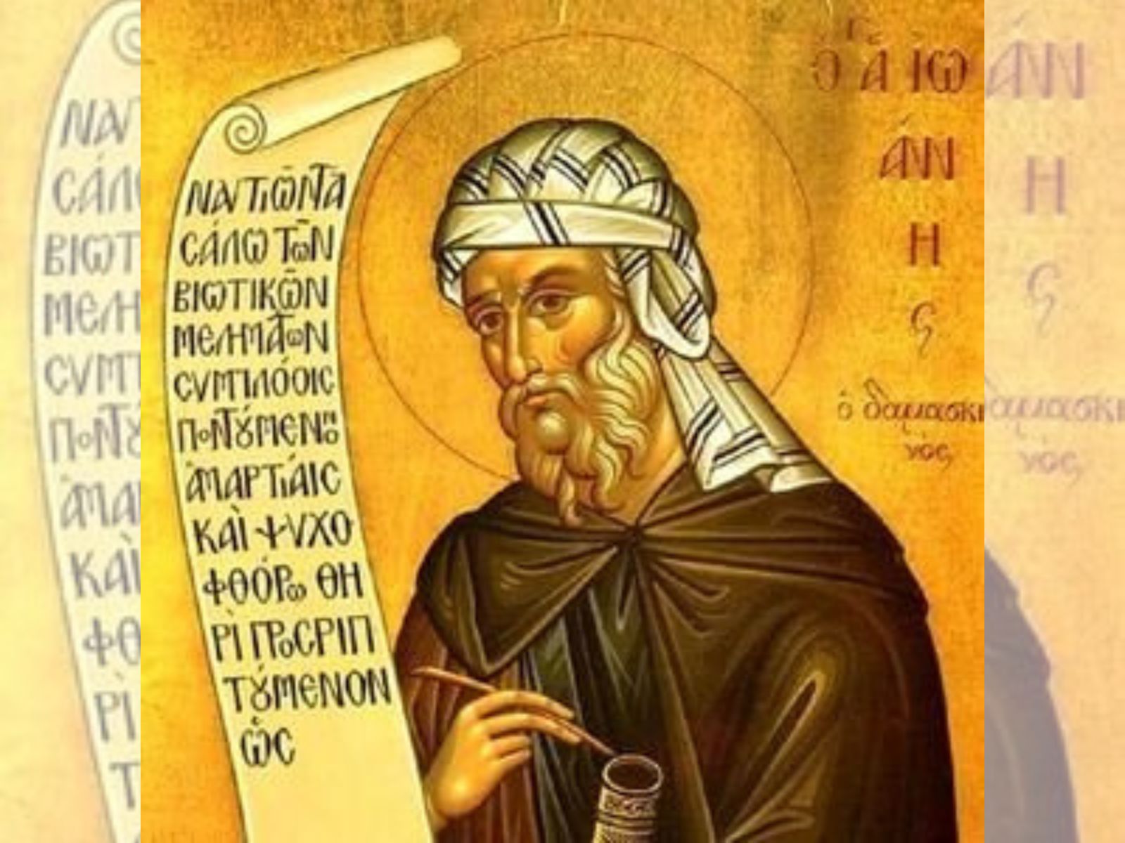 São João Damasceno, um santo Padre e Doutor da Igreja de Cristo. Nasceu em 675, em Damasco (Síria), num período em que o Cristianismo tinha uma certa liberdade. O pai de João era muito cristão e amigo dos Sarracenos, os quais, naquela época, eram senhores do país. Essa estima estendia-se também ao filho. Os raros talentos e méritos desse levaram o Califa a distingui-lo com a sua confiança e nomeá-lo prefeito (mansur) de Damasco.