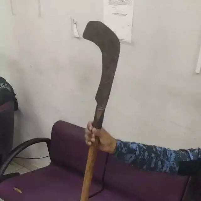 Foi dada a ordem para ele abaixar a arma, porém, o sujeito não obedeceu e investiu contra a equipe. Por segurança, os guardas efetuaram três disparos de bala de borracha, fazendo o autor cair no chão. A foice foi retirada de perto dele.