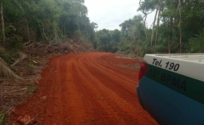 Usando máquinas, o infrator suprimiu a vegetação de grande porte e construiu a estrada com 800 metros de comprimento, por 10 metros de largura (0,8 hectare), que já se encontrava cascalhada, tudo sem a licença ambiental obrigatória.