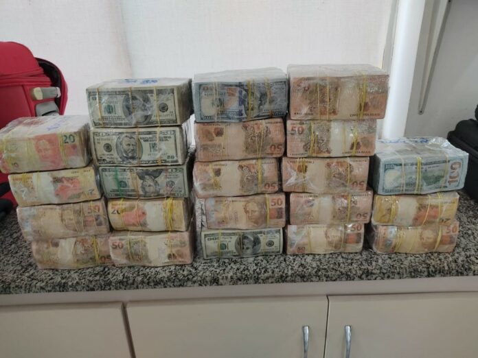 Na tarde de hoje (26), a Polícia Rodoviária Federal (PRF) prendeu um pedreiro, de 46 anos, com duas malas recheadas com cédulas de real e dólar. O homem estava no interior de um ônibus de viagem que saiu do estado do Rio de Janeiro em direção a Campo Grande.