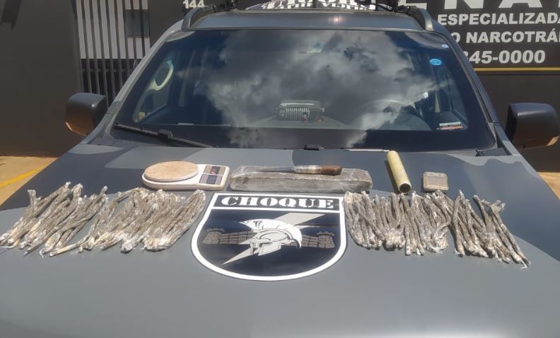 Próximo a ele foi achado uma mochila contendo 130 invólucros de maconha prontos para venda, além de um tablete do mesmo entorpecente, uma faca, um rolo de papel filme e duas balanças de precisão.