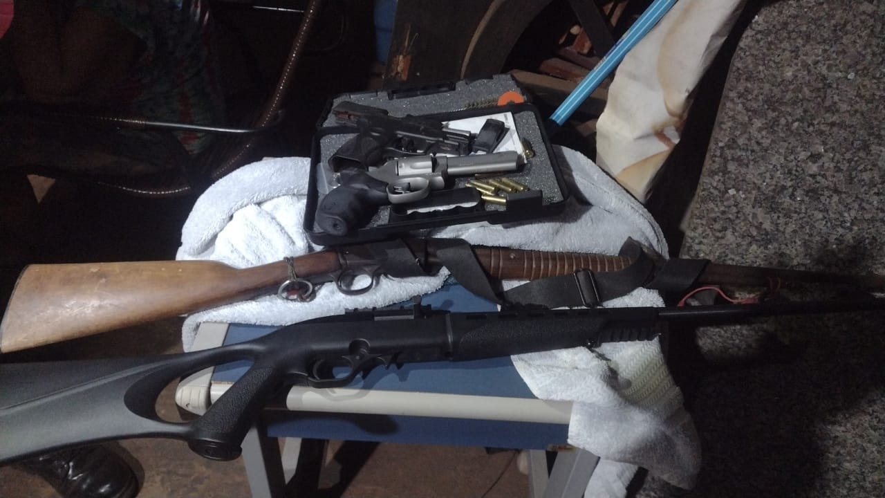 Ao perceber a chegada das viaturas, o suspeito tentou fugir pelos fundos da residência, mas acabou capturado em um terreno baldio ao lado. Durante as buscas, os policiais encontraram um verdadeiro arsenal dentro da casa do idoso, composto por: