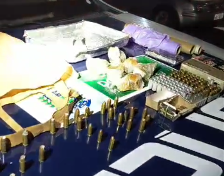 Em vistoria, foi encontrado uma bolsa em cima do guarda roupa, contendo outras 129 munições de diversos calibres. No quarto das crianças embaixo da cama, os militares localizaram 300 gramas de cocaína, além de balança de precisão, faca com resquícios do entorpecente e papel filme usado para condicionamento da droga.