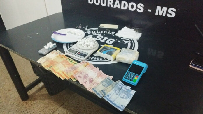 Dinheiro, máquina de cartão, balança e cocaína apreendidos com traficante (Foto: Adilson Domingos/Dourados Informa)