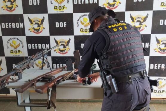 Foram apreendidos quatro armas, sendo uma calibre 12, dois fuzis de calibre 7,62 e uma pistola 9mm, além de dois carregadores, um cinto tático camuflado, uma luneta para arma longa, um tripé para arma longa, uma lanterna com mira laser e trilho para acoplar em arma de fogo.