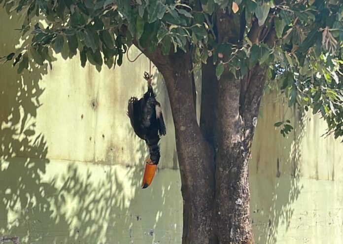 Homem pendura tucano morto em galho de árvore no centro da cidade de Água Clara