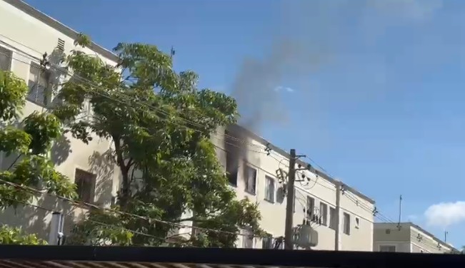 Imagem mostra uma grande quantidade de fumaça escura saindo do apartamento, além de chamas visíveis pelas janelas. As equipes do Corpo de Bombeiros foram acionadas por volta das 6h e conseguiram conter o fogo antes que ele se espalhasse para outros imóveis.