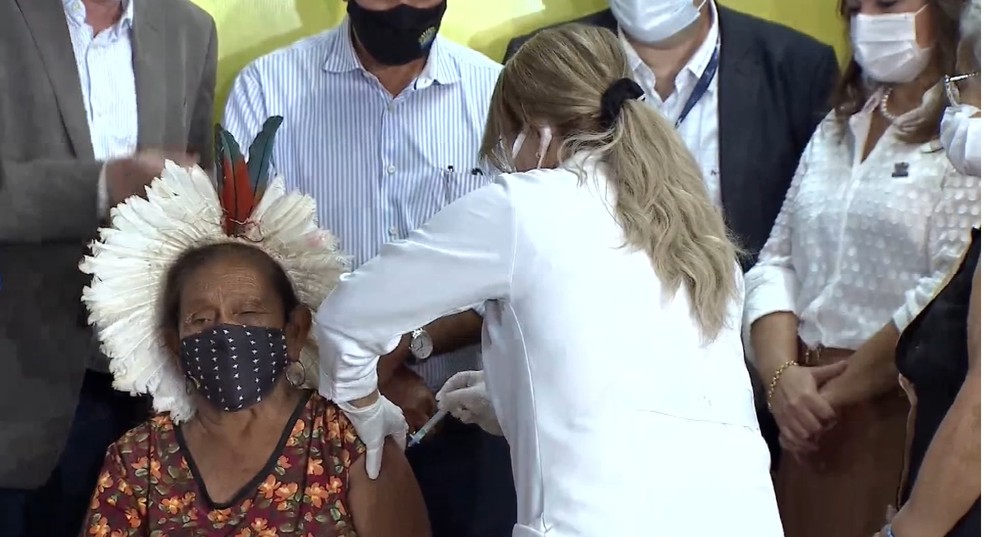 A indígena Domingas da Silva, de 91 anos, foi a primeira pessoa a ser vacinada em Mato Grosso do Sul, durante um evento simbólico realizado na tarde desta quarta-feira (18) no Hospital Regional de Campo Grande. Outras três pessoas também receberam a vacina, marcando o início das vacinações.