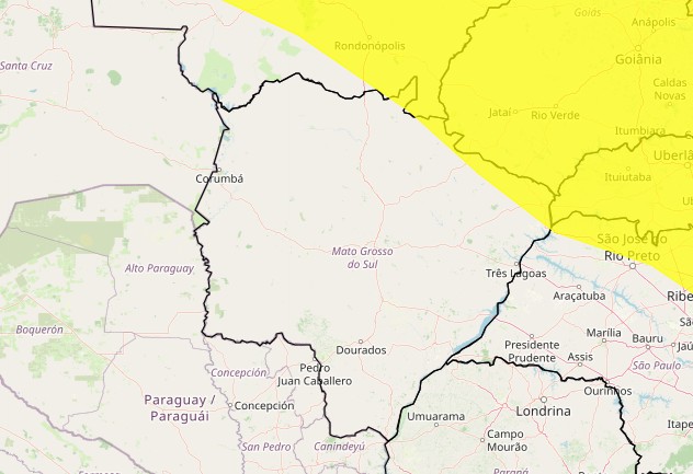 O alerta amarelo atinge os municípios das regiões centro-norte e leste, indicando chuvas de 20 a 30 mm por hora ou 50 mm por dia, com ventos de 40 a 60 km/h. Estão sob aviso as cidades de Alcinópolis, Aparecida do Taboado, Cassilândia, Chapadão do Sul, Costa Rica, Inocência, Paranaíba, Pedro Gomes e Sonora.
