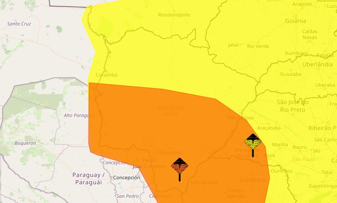 O alerta laranja, de grau de perigo, indica risco de chuva entre 30 mm e 60 mm por hora, ventos que podem chegar a 100 km/h e queda de granizo, com validade até às 18 horas de domingo (2). Ao todo, 61 dos 79 municípios estão sob aviso, sendo as cidades de A lista tem Água Clara, Anaurilândia, Angélica, Antônio João, Aquidauana, Aral Moreira, Bandeirantes, Bataguassu, Batayporã, Bela Vista, Bodoquena, Bonito, Brasilândia, Caarapó, Campo Grande, Caracol, Corguinho. Coronel Sapucaia, Corumbá, Deodápolis, Dois Irmãos do Buriti, Douradina, Dourados, Eldorado, Fátima do Sul, Glória de Dourados, Guia Lopes da Laguna, Iguatemi, Itaporã, Itaquiraí.