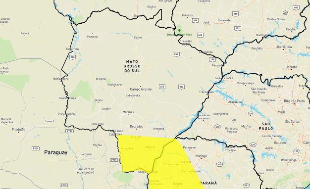 O Instituto Nacional de Meteorologia (Inmet) emitiu um alerta na manhã deste domingo para tempestade em Mato Grosso do Sul. O comunicado informa que as chuvas devem atingir 21 municípios localizados na região sul do Estado e tem validade até as 23h59 de hoje.