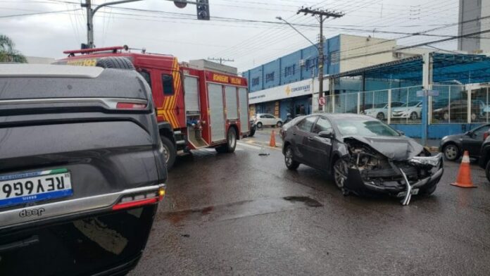 Um veículo capotou após se envolver em um acidente com outros dois carros na manhã desta sexta-feira (25) no cruzamento da Avenida Ceará com a Rua Piratininga, na região do Jardim dos Estados, em Campo Grande.