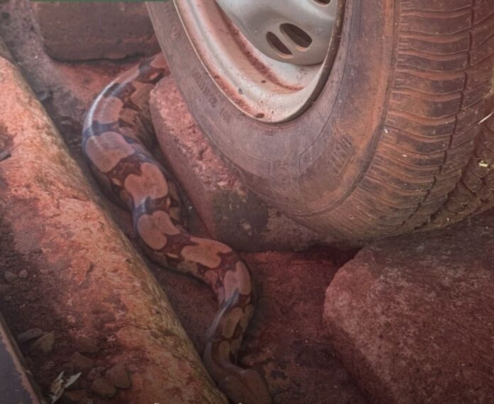 Uma jiboia foi resgatada pela Polícia Militar Ambiental (PMA) nessa terça-feira (14), próxima de um trailer de lanche localizado em frente ao Parque das Nações Indígenas, na Avenida Afonso Pena, em Campo Grande.