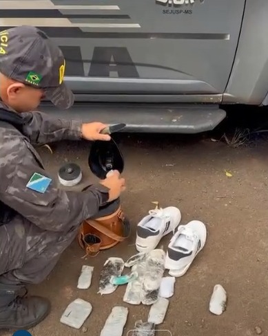 Diante disso, foi realizada a vistoria nos pertences, ocasião em que entorpecentes foram encontrados no interior de uma garrafa térmica. Pressionada sobre os fatos, ela confessou que transportava mais droga amarrada em seu corpo.