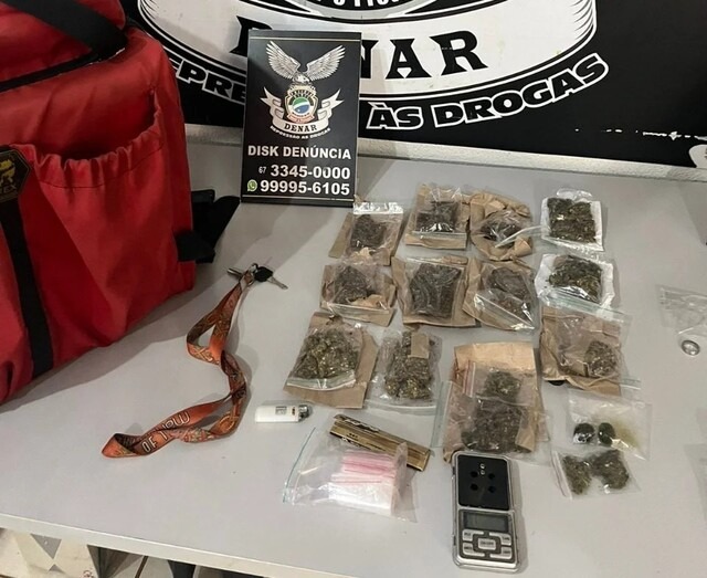 Um motociclista foi preso na tarde de quinta-feira (05), em Campo Grande, por fazer a entrega de drogas no sistema delivery. O traficante usava até mesmo uma mochila térmica ilustrada pelo simbolo de uma empresa de entregas por aplicativo de comida para disfarçar o crime.
