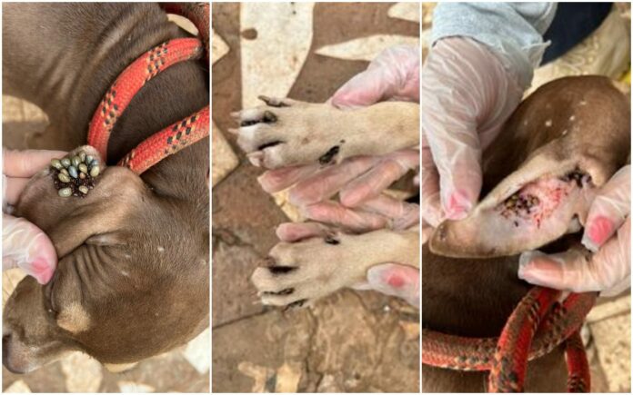A equipe se deslocou até a residência, onde encontrou o cachorro infestado de carrapatos e muito magro, além de viver em um ambiente insalubre, com muitas fezes, urina e sem alimentação adequada.