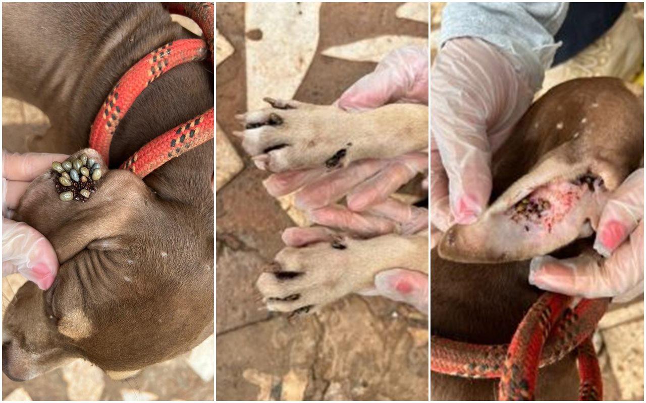 A equipe se deslocou até a residência, onde encontrou o cachorro infestado de carrapatos e muito magro, além de viver em um ambiente insalubre, com muitas fezes, urina e sem alimentação adequada.