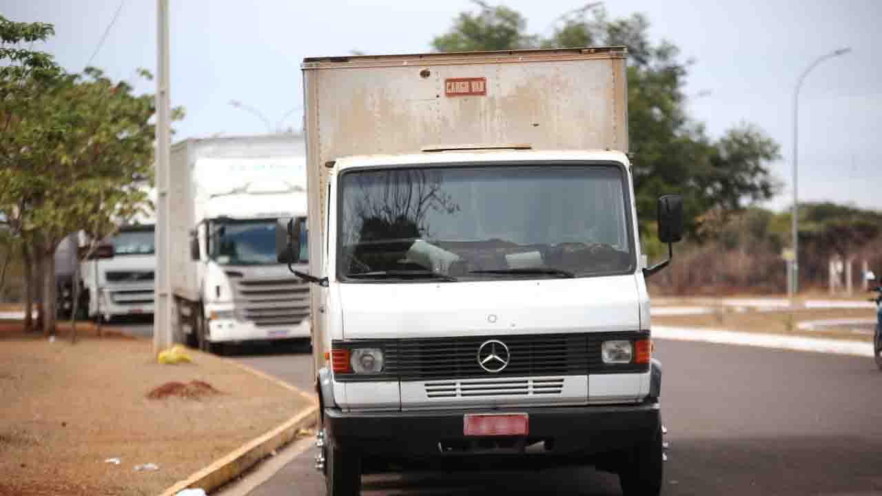 Caminhões parados na faixa amarela atrapalham visibilidade de motoristas (Foto: Marcos Ermínio / Midiamax)