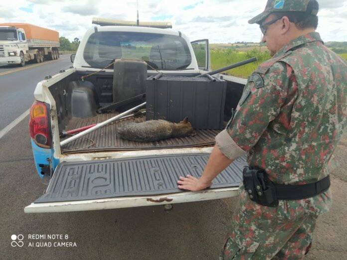 Policiais Militares Ambientais de Mundo Novo receberam informações de usuários que passaram pela rodovia BR 163, no município ontem (2), de que havia um animal silvestre ferido à margem da rodovia, nas proximidades do assentamento Pedro Ramalho.