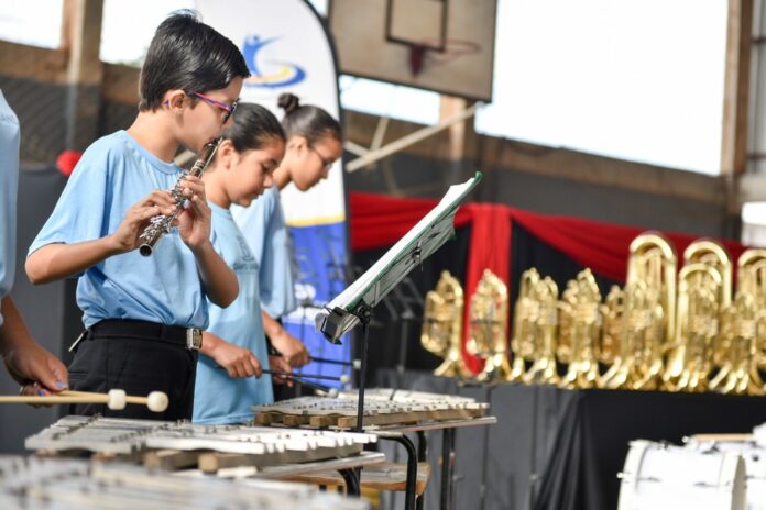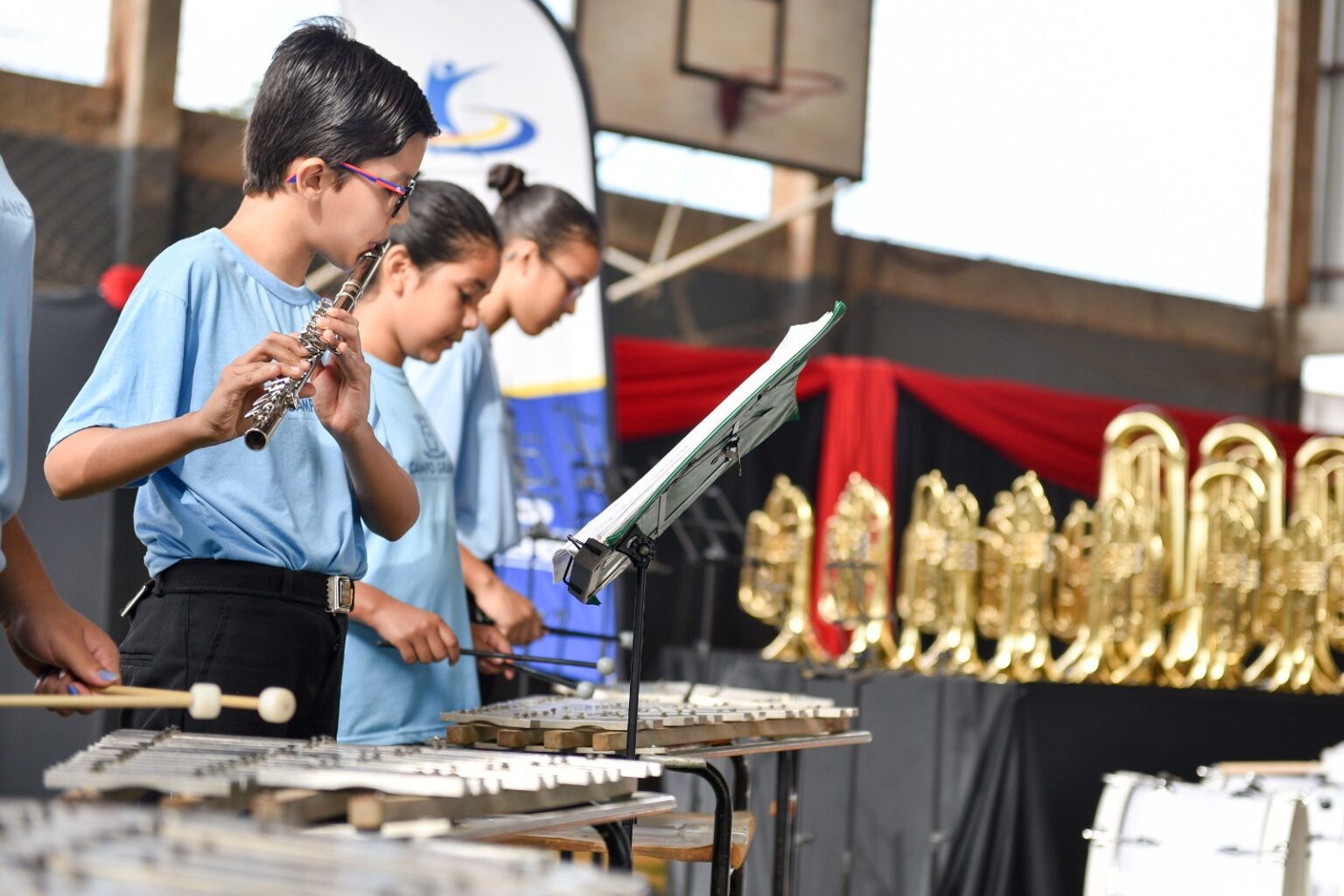 Outra grande entrega de 115 novos instrumentos marcou a comunidade escolar de Campo Grande nesta quinta-feira (23). Alunos da região do Dom Antônio Barbosa, Parque do Sol e Vila Caiçara foram contemplados. A Escola Municipal Padre Thomaz Ghirardelli foi a primeira a receber 60 novos instrumentos para a banda de fanfarra. Depois, foi a vez da Escola Municipal Dr. Tertulliano Meireles que recebeu 55 instrumentos.