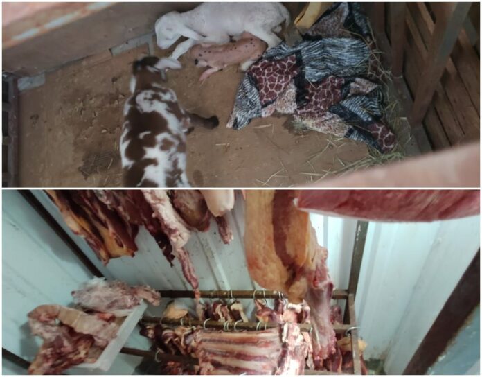 Além disso, no corredor de acesso, nas câmaras frias, os proprietários mantinham um cachorro, um porco e um cabrito vivos. Os três foram recolhidos e levados para uma chácara.