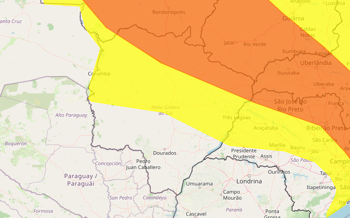 Grande parte de Mato Grosso do Sul está em alerta para a ocorrência de chuvas intensas ao longo das próximas horas, conforme aviso emitido neste domingo (24), pelo Instituto Nacional de Meteorologia (Inmet).