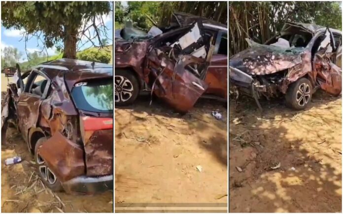O automóvel saiu da pista e capotou por várias vezes até parar no meio da vegetação existente às margens, completamente destruído.