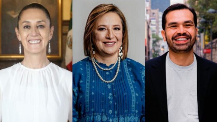 Da esquerda para direita, os candidatos à Presidência do México Claudia Sheinbaum (Sigamos Haciendo Historia, centro-esquerda), Xóchitl Gálvez (Fuerza y Corazón por México, centro) e Jorge Álvarez Máynez, (Movimiento Ciudadano, centro-esquerda) - (Foto: Reprodução/Facebook)