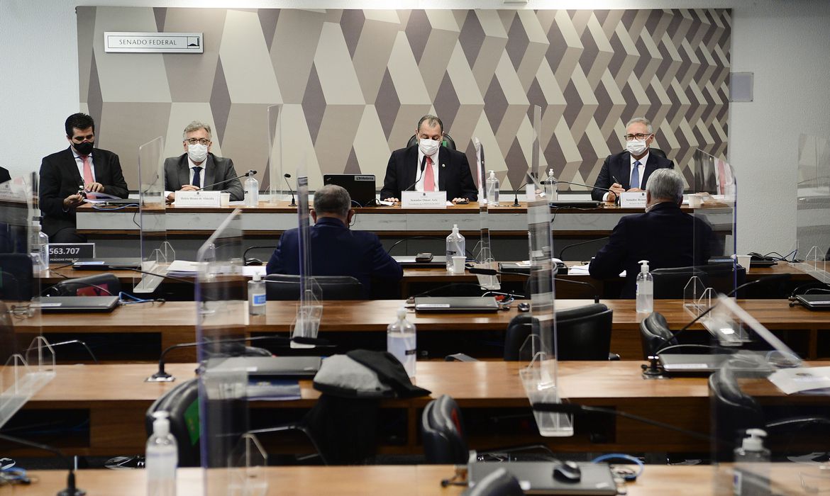 Comissão Parlamentar de Inquérito da Pandemia (CPIPANDEMIA) realiza oitiva do presidente da ONG Instituto Força Brasil. O depoente é apontado como elo entre representantes da empresa Davati Medical Supply, que negociava a venda de vacinas, e o Ministério da Saúde. Mesa: advogado Sanzio Nogueira; advogado João Carlos Krakauer; presidente da ONG Instituto Força Brasil, tenente-coronel da reserva Helcio Bruno de Almeida; presidente da CPIPANDEMIA, senador Omar Aziz (PSD-AM); relator da CPIPANDEMIA, senador Renan Calheiros (MDB-AL). Foto: Pedro França/Agência Senado