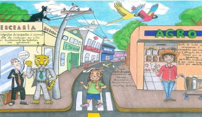 Orientado pelo professor Matheus Roque, da Escola Estadual José Maria Hugo Rodrigues, onde estuda, Marcelo diz que quis colocar no papel, de forma lúdica, temas que representam a educação fiscal e, para isso, pegou características do povo sul-mato-grossense. “Nós temos aqui os fazendeiros que pagam seus impostos, os índios que integram a segunda maior população indígena do Brasil e a onça pintada que é um animal imponente e símbolo do Pantanal e do Estado”, lembra.