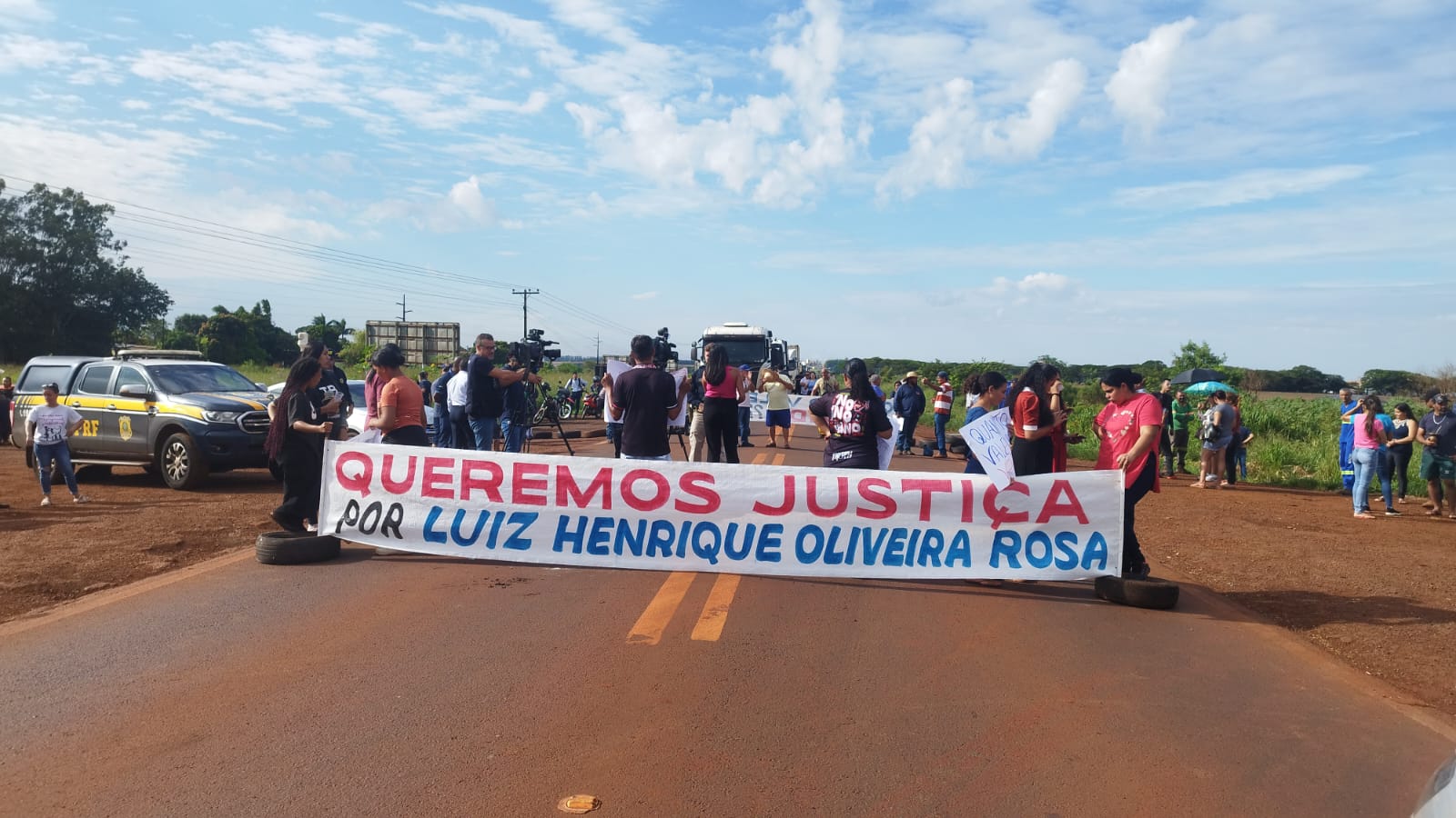 Manifestantes estão bloqueando a rodovia federal BR-163, entre Dourados e Caarapó, solicitando melhorias na infraestrutura viária, especialmente equipamentos para a segurança no trânsito. Ao todo, cerca de 50 pessoas usam uma faixa para impedir o fluxo de veículos, pedindo “Justiça por Luiz Henrique Oliveira Rosa“.