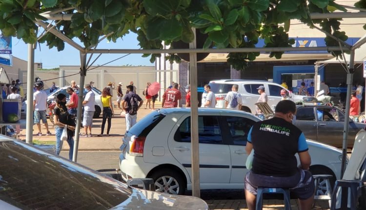 Beneficiários do Auxílio Emergencial e do Auxílio Emergencial Extensão fizeram fila neste sábado (28) para conseguir sacar dinheiro na agência da Caixa Econômica Federal da Avenida Júlio de Castilho, em Campo Grande.